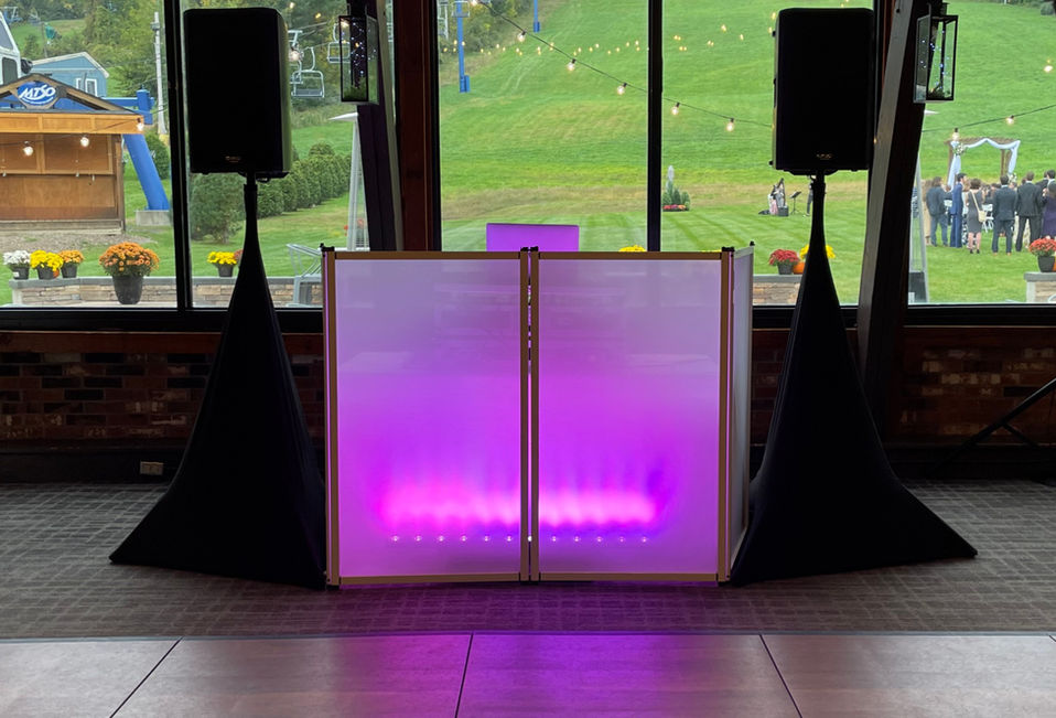 Includes: 12" Loudspeaker, 2x wireless lapel mics, laptop w/ DJ Controller, table & facade